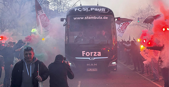 Pyro, Böller, Fackeln und Gesänge: St.Pauli-Fans stehen Spalier für Bus mit Spielern